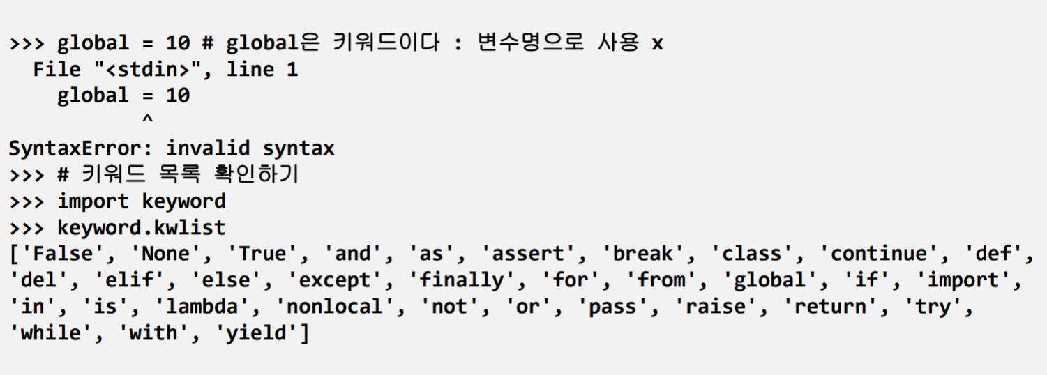 예약어 (Python이 이미 사용하기로 지정해 둔 문자열)