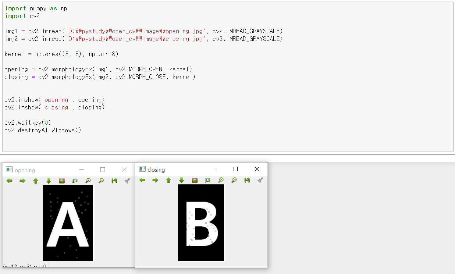 opencv - morphologyEx()함수를 이용한 Opening과 Closing(노이즈 제거) 본문